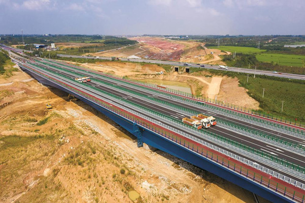 G312合六葉公路橋跨越引江濟(jì)淮航道,是國家重大跨省、跨流域調(diào)水工程——引江濟(jì)淮工程的重要組成部分。該橋?yàn)槁犯臉蚬こ?,在原有國道改航道的基礎(chǔ)上,建設(shè)鋼箱梁橋連接河堤兩岸。大橋全長540米、主跨180米,整橋鋼箱梁由4幅連續(xù)梁組成,橋面全寬52.5米,為雙向8車道。該橋的開通運(yùn)行,為加快引江濟(jì)淮河渠剩余工程完成創(chuàng)造了施工條件。