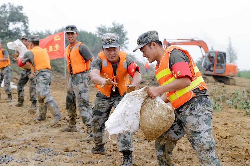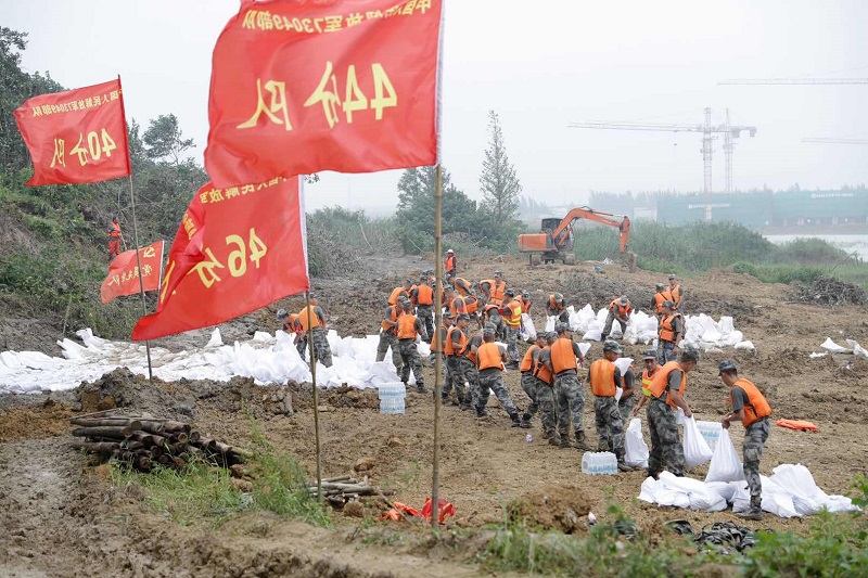 嚴(yán)店鄉(xiāng)蓮花圩派河大堤上,官兵奮戰(zhàn)在抗洪搶險(xiǎn)一線。