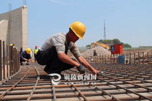 5月2日,記者在引江濟淮工程樅陽樞紐節(jié)制閘施工現(xiàn)場看到,大型挖掘機、工程運輸車等大型機械和施工人員正緊張有序作業(yè)。正在和工友們一起用鐵絲綁扎雷諾護墊,鋪設(shè)防沖槽的瓦工何池玉告訴記者,他來自安慶市迎江區(qū),今年因疫情影響沒有到外省務(wù)工,而是選擇參與到引江濟淮工程樅陽樞紐的建設(shè)。“這個工程重大,質(zhì)量要求也高,工期又很緊,最近一段時間大家都是加班加點地在工作,‘五一’期間沒有一個回家的,確保按時按質(zhì)按量地完成每一項工作。”