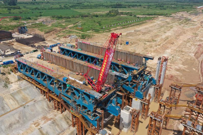 8月4日上午9時,淠河總干渠渡槽施工現(xiàn)場,一件重達(dá)76噸的鋼渡槽拱弦C11構(gòu)件穩(wěn)穩(wěn)落下。
